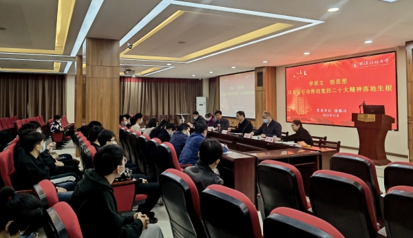徐雁冰從深悟大會的主題、深悟過去五年的工作和新時代十年偉大變革、深悟開辟馬克思主義中國話時代化的新境界、深悟新時代新征程中國共產(chǎn)黨的使命任務、深悟教育科技人才重大支撐、深悟團結奮斗與青年強則國家強等六個方面,對黨的二十大報告作了深入淺出的分析與解讀,并結合學校、學院實際,就如何學習貫徹二十大報告精神提出了具體的要求,為在場師生上了一場精彩的思政課。