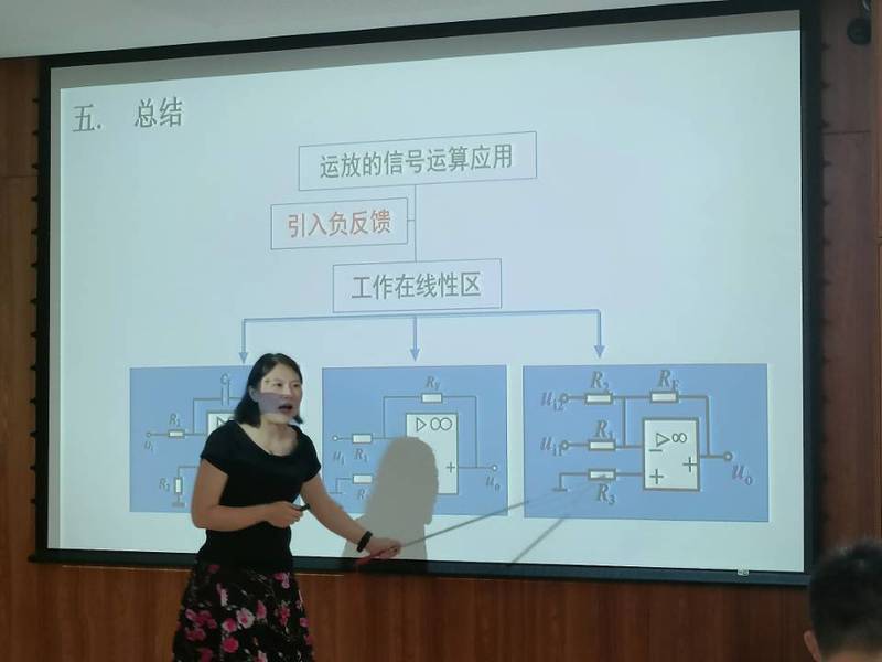 電工電子基礎(chǔ)課部的青年講師周鈺杰從PI自動(dòng)溫度調(diào)節(jié)工程應(yīng)用的科普視頻入手,剖析任務(wù),并將其細(xì)化為三類(lèi)運(yùn)算放大器的負(fù)反饋使用。“把握虛短和虛斷兩個(gè)方法,可以解決反向比例、反向加法和積分運(yùn)算三大電路?!彼?dāng)堂布置學(xué)習(xí)通習(xí)題檢驗(yàn)教學(xué)成果,富有穿透力的聲音感染了在場(chǎng)觀眾。