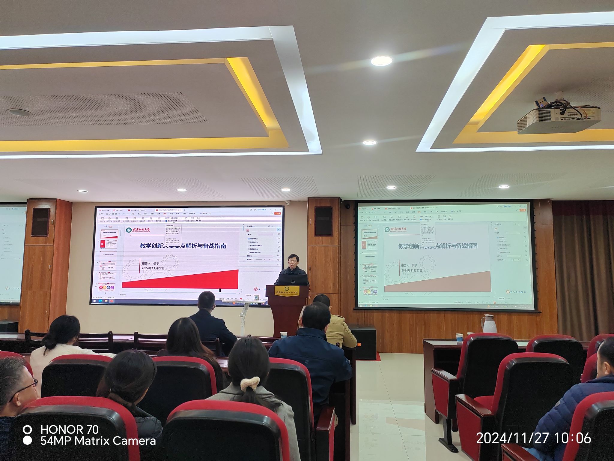 為迎接教學(xué)創(chuàng)新大賽,提升教師教學(xué)能力,提高教學(xué)創(chuàng)新水平,11月27日,學(xué)院特邀請(qǐng)全國(guó)教學(xué)創(chuàng)新大賽一等獎(jiǎng)獲得者、機(jī)械學(xué)院侯宇教授做《教學(xué)創(chuàng)新大賽要點(diǎn)解析與備戰(zhàn)指南》專題培訓(xùn),學(xué)院黨委書記冒穎、40名教師參加培訓(xùn),培訓(xùn)由學(xué)院副院長(zhǎng)程磊主持。