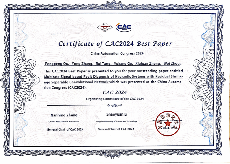 近日,在山東省青島市舉行的2024中國自動(dòng)化大會(huì)(CAC2024)上,集團(tuán)碩士生屈鵬鵬和博士生周煒在張永教授的指導(dǎo)下合作的論文《Multirate Signal based Fault Diagnosis of Hydraulic Systems with Residual Shrinkage Separable Convolutional Network》,榮獲CAC2024最佳論文獎(jiǎng)。大會(huì)共接收論文1500篇,評(píng)選出12篇最佳論文。