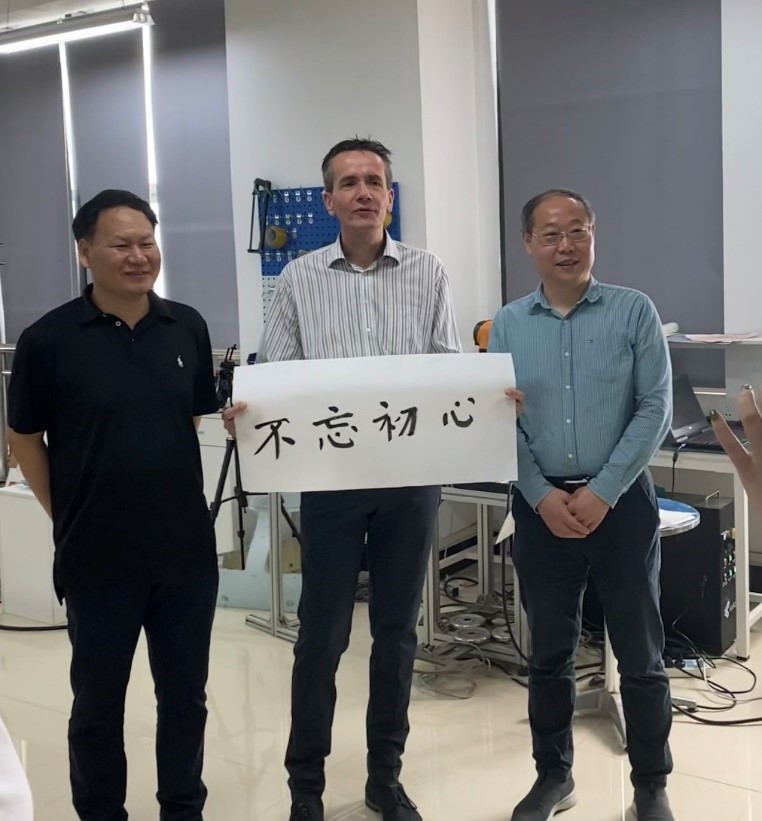 圖3 人工智能學(xué)院黨委書(shū)記劉運(yùn)顯、機(jī)器人研究院院長(zhǎng)閔華松教授與富邦科技全球技術(shù)總監(jiān)Erik合影留念