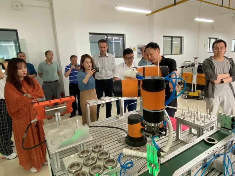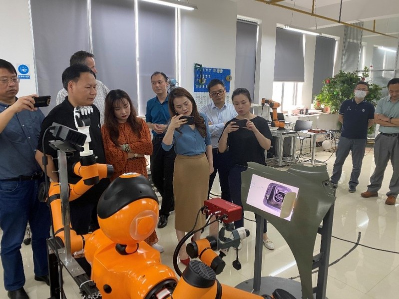 參觀過(guò)程中,閔華松教授團(tuán)隊(duì)向參觀人員展示了機(jī)器人技術(shù)實(shí)訓(xùn)平臺(tái)、書(shū)法機(jī)器人、移動(dòng)雙臂機(jī)器人、水果采摘機(jī)器人、新能源汽車自動(dòng)充電機(jī)器人等項(xiàng)目,并對(duì)這些項(xiàng)目的相關(guān)技術(shù)和應(yīng)用價(jià)值進(jìn)行介紹。目前,機(jī)器人可代替或協(xié)助人類完成各種工作,并廣泛應(yīng)用于制造業(yè)領(lǐng)域。機(jī)器人已成為先進(jìn)制造技術(shù)領(lǐng)域不可缺少的自動(dòng)化設(shè)備。