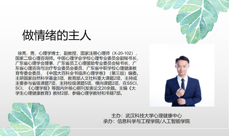 12月13日晚,集團(tuán)于線上開(kāi)展第二十七期沁心講壇報(bào)告會(huì),報(bào)告主題為“做情緒的主人”。會(huì)議主講人徐亮,心理學(xué)博士,副教授,國(guó)家注冊(cè)心理師,國(guó)家二級(jí)心理咨詢師。